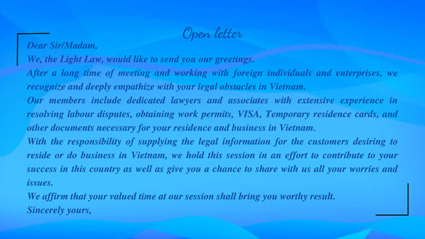 We, the Light Law, who takes the responsibility in supplying the legal information for the foreigners desiring to reside or do the business in Vietnam, decides to hold the session: Free Legal Consultation For Foreigners at our office in an effort to contribute to your success in this country as well as give you a chance to share with us all your worries and issues.